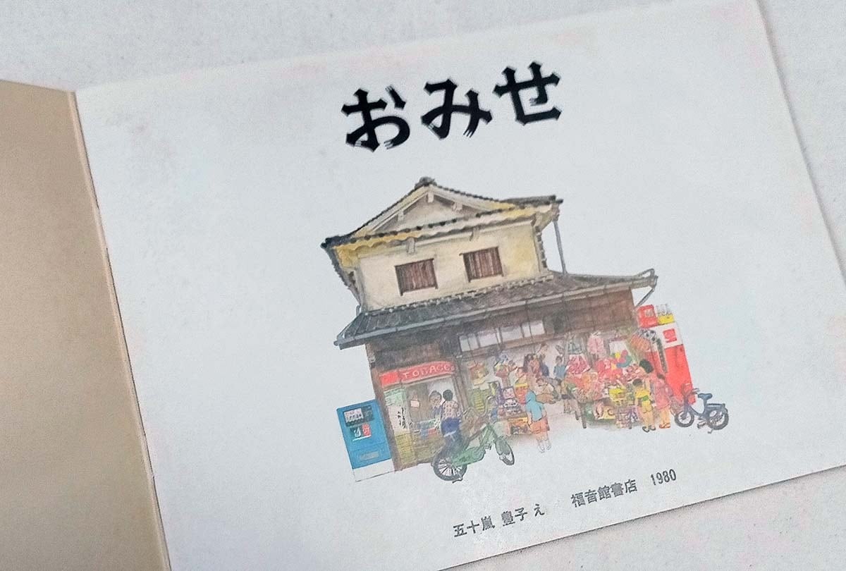 昭和の商店のお店構えが描かれている懐かしくなる絵本です。